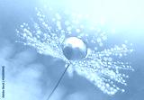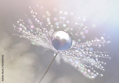 Beautiful dew drops on a dandelion seed macro. Beautiful blue background. Large golden dew drops on a parachute dandelion. Soft dreamy tender artistic image form.