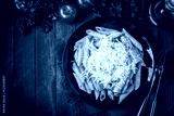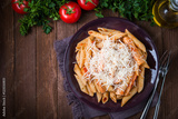Penne pasta with chicken, tomato sauce and parmesan cheese on dark wooden background top view. Italian cuisine. Space for text.