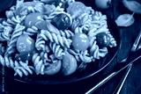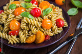 Fusilli pasta salad with pesto genovese, colorful tomatoes and basil leaves on dark wooden background close up. Italian cuisine. Delicious meal.