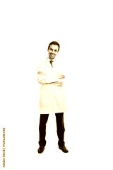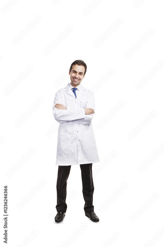 Smiling male doctor in a white coat, arms crossed, standing confidently on a clean white background. Concept of medical professionalism