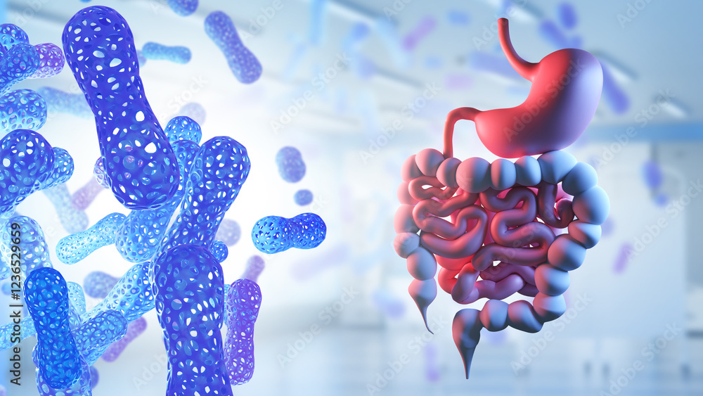 Probiotics for digestive system. Gastrointestinal tract. Microbiota in digestive system. Probiotics from dietary supplements. Microbiota cells near esophagus. Probiotic for immunity. 3d image