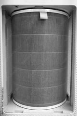 A cylindrical air purifier filter with a darkened surface, indicating dust and pollutant buildup. The fine mesh structure traps particles like PM2.5, pollen, and allergens.