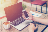 Young business man hand holding phone and using laptop in coffee