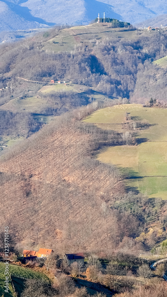 Scenic view of rolling hills and dense forests in Northern Italy, capturing peaceful countryside and autumn's beauty