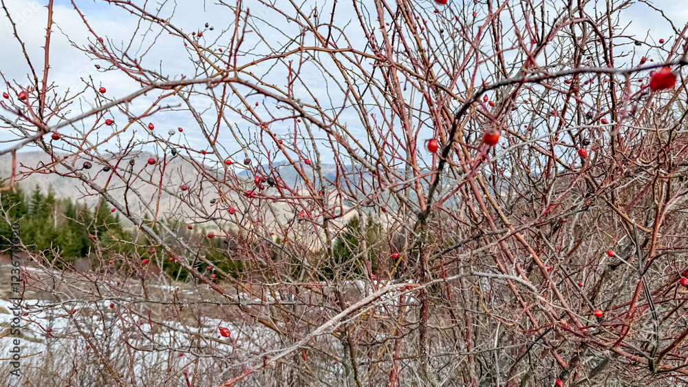 Barren winter landscape with red berries on thorny branches symbolizes resilience and the beauty of nature in harsh conditions