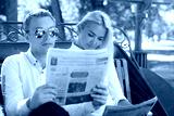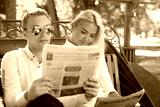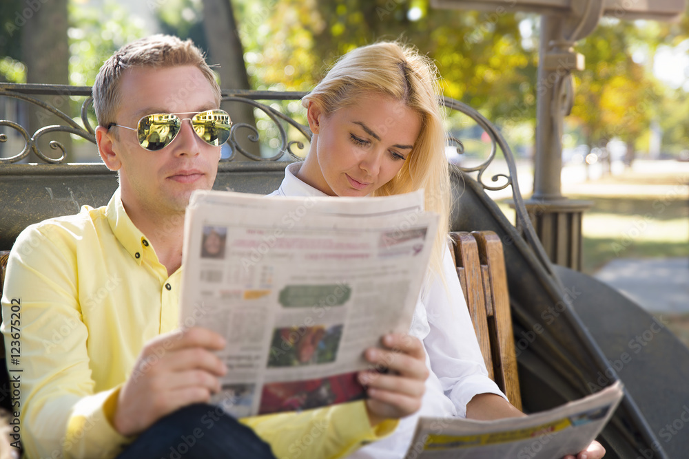 Man and woman reading newspaper on a bench. Warm autumn and sunny day in the park.
