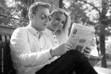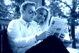 Man and woman reading newspaper on a bench. Warm autumn and sunny day in the park.