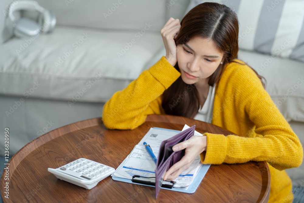 stressed woman trying money to pay credit card debt and worry by calculate expense from invoice or electricity bill,water bill not able money to pay mortgage.debt,loan,bankruptcy,Bad financial concept