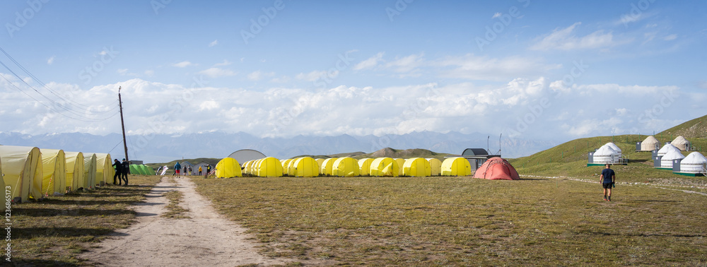 View on expedition mountaineering camp with many yellow tents and yurts, Pamir Mountains, Kyrgyzstan