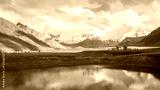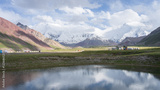 Beautiful alpine landscape with snowy Pamir Mountains and nomadic yurts and lake, Kyrgyzstan