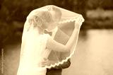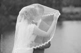 Bride and groom kissing under veil outdoors