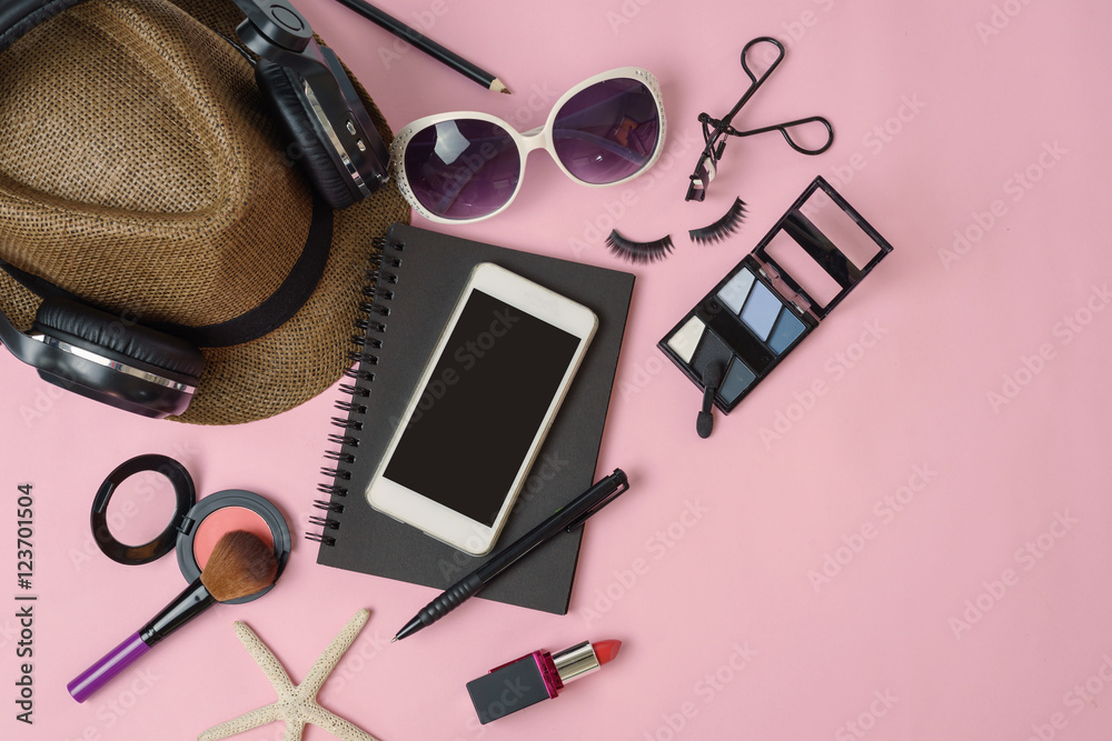 woman makeup and accessories isolated on pink background