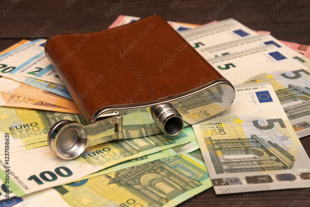 The flask and euro bills are a metaphor for personal problems and financial dependence.