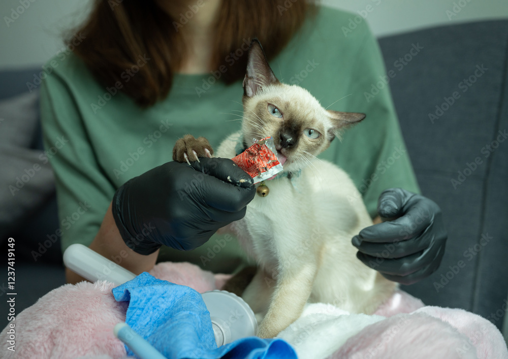 Pet's owner feeding liquid snack to her Siamese cat. Your cat needs some variety in its diet as well as a tasty treat.