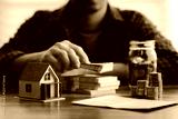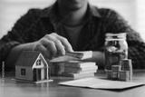 Man organizes cash with coins, a contract, and a miniature house, symbolizing financial management, investment, and real estate planning. Savings Plan, Down Payment, Mortgage, Home Equity.