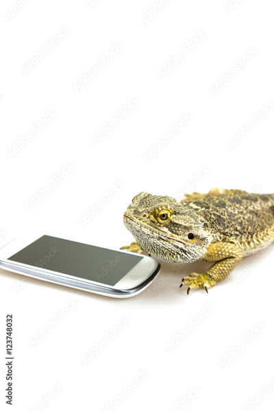 Agama lizard is lying on the white background with empty display of the lying smart phone. All potential trademarks are removed. Vertically.