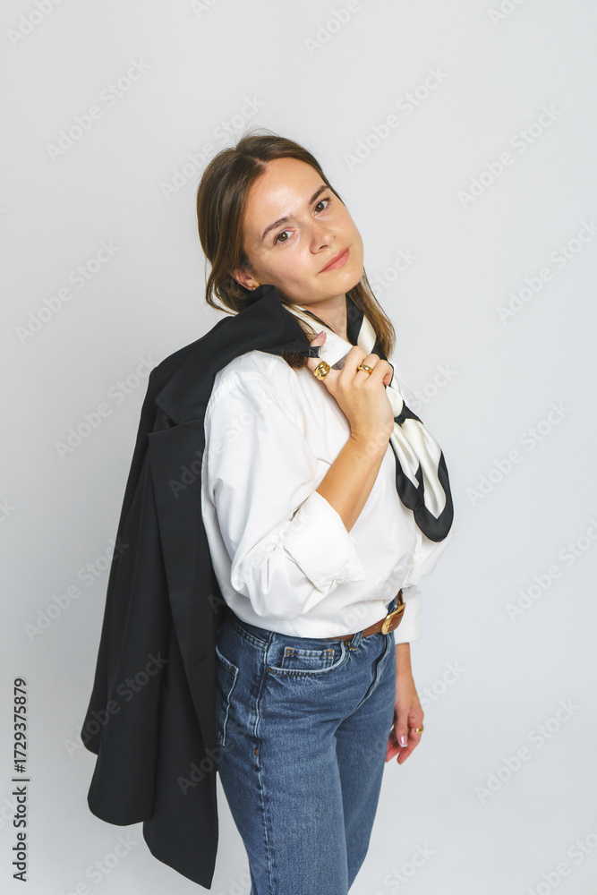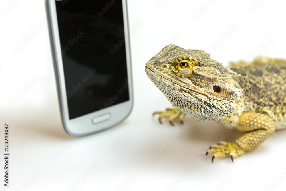 Closeup view of the agama lizard lying on the white background and looking on the black display of the standing smart phone. All potential trademarks are removed.