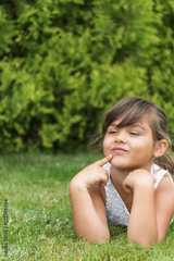 Happy little girl in a white dress is lying on a lawn. Girl is looking on the right side.