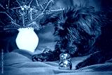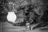 Puppy of Giant Black Schnauzer dog is lying on the red cloth and is sniffing golden Christmas bulbs. Edited as a vintage photo with dark edges.