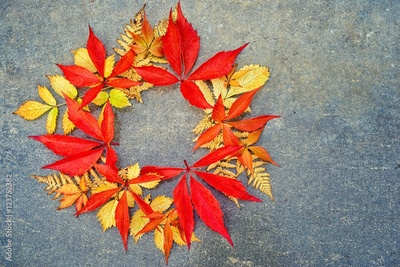 Circle from many different colorful autumn leaves on a neutral grey background with copy space for your inscription in a side and in the middle