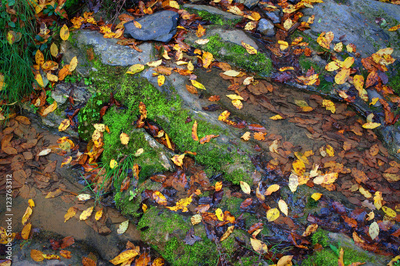 Forest stream with mossed stones and autumn leaves