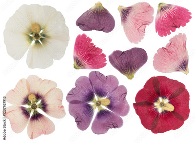 Pressed and dried flower mallow (malva), isolated on white background. For use in scrapbooking, floristry or herbarium.