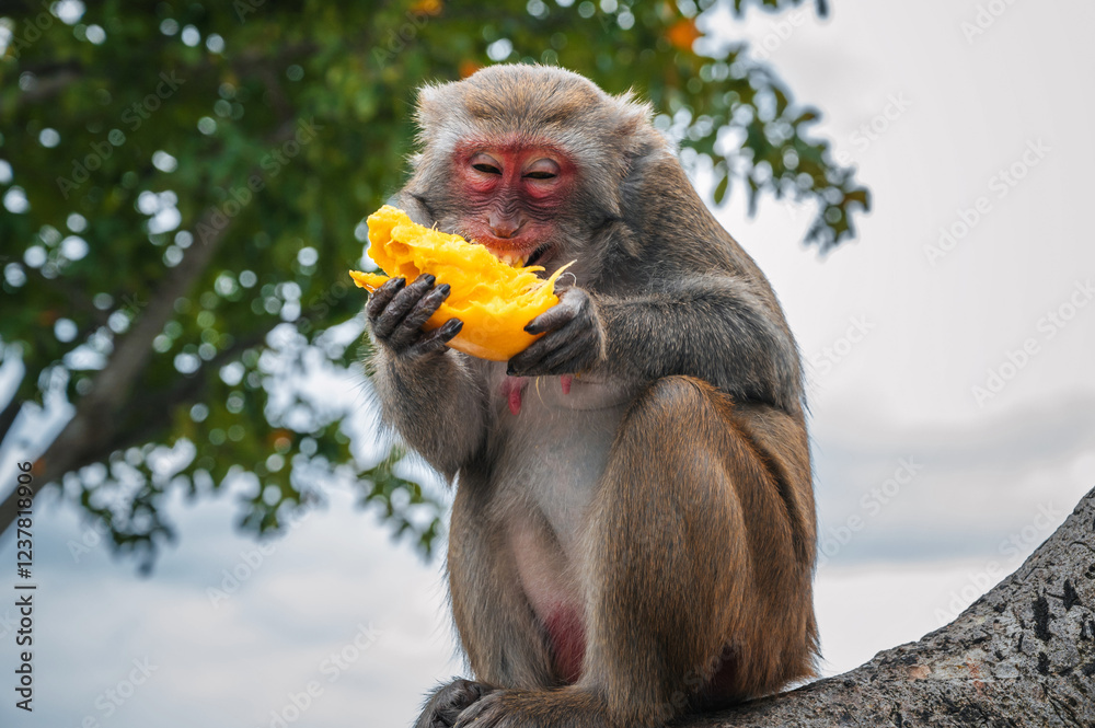 Happy funny monkey eats mango sitting on a tree in the forest in the wild nature