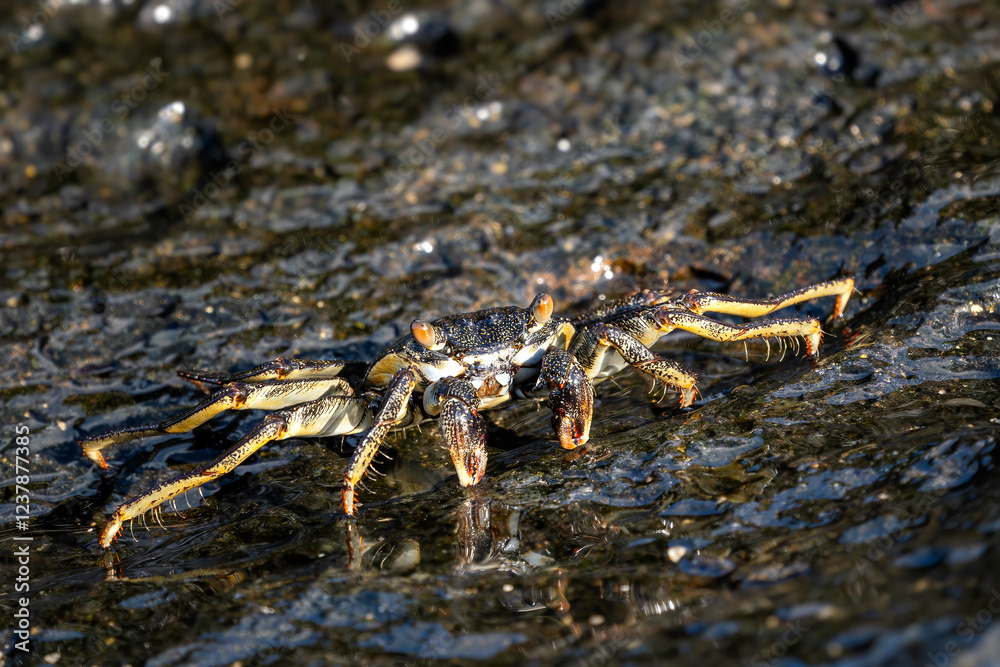 Natal Lightfoot Crab - Grapsus tenuicrustatus, common beautiful crab from Indo-Pacific shores and beaches, Mauritius island.