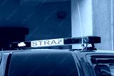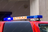 Polish state fire brigade. a heavy fire extinguishing vehicle and a command vehicle standing with a signal and blue lights against the background of a building. rescue and firefighting operation.