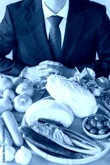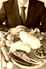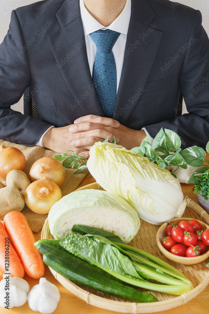 テーブルいっぱいの野菜とビジネスマン