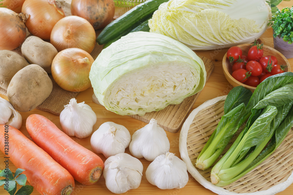 いっぱいの野菜|キャベツ・ミニトマト・きゅうり・白菜・小松菜・ニンニク・ジャガイモ・玉ねぎ・人参