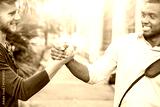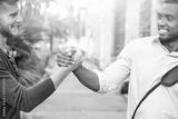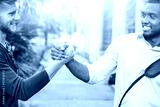 Interracial friends greating each other with handshaking in the street cropped image - Young business men friendly hands gesture outdoors - Concept of friendship and different people relations