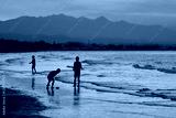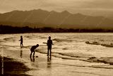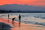 The Qurum Beach in Muscat, Oman at sunset, with a blazing sky and Omani children playing on the seashore
