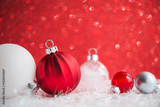 Red and white xmas ornaments on red glitter bokeh background. Merry christmas card. Winter holiday theme. Happy New Year. Space for text.