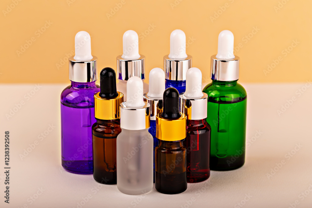 Mockup. Colorful glass dropper bottles featuring on beige background. Concept packaging and usage. Dropper bottles for oils or serums. Cosmetic and medical dropper bottles with liquids