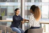 Cheerful young Indian woman applicant shaking hands HR manager after successfully passed casting express respect feel happy finish meeting in company office. Hiring, human resources, deal, partnership