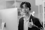 portrait asian man call center smile for success telemarketing,Contact us,CRM,customer service.Team insurance agent support using headset in communication or conversation at customer sales services