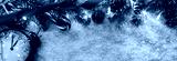 Christmas fir tree with lights and clock on snow in dark, view from above