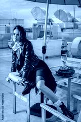 Model in leather jacket.