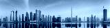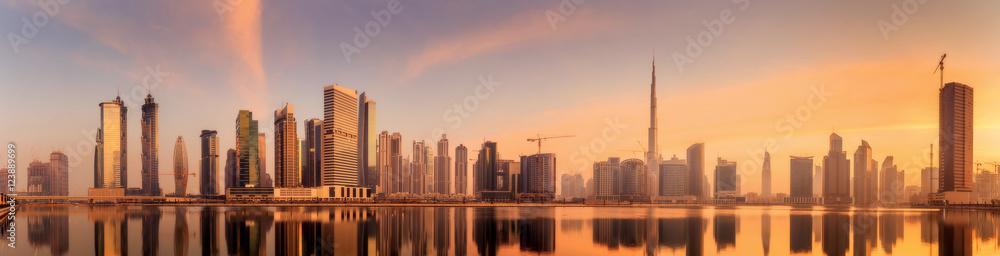Panoramic view of Business bay and downtown area of Dubai, reflection in a river, UAE