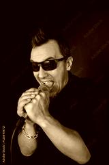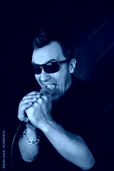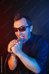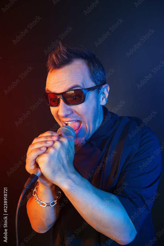 Rock singer sings and scerams with microphone and sunglasses against red and blue background