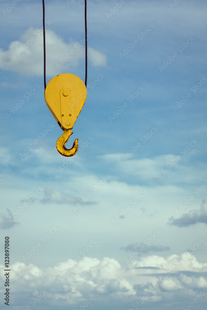 Isolated black and yellow cranes hooks hanging on steel with cli