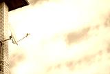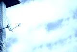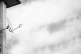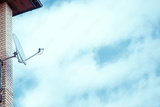 Side view of white satellite dish with blue sky