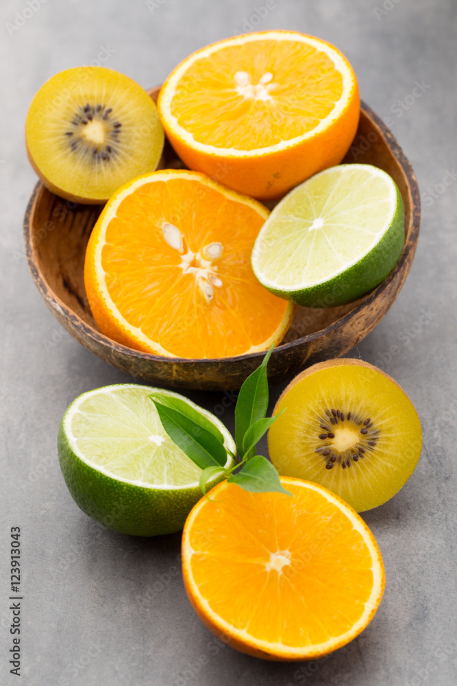 Mixed citrus fruit lemons, orange, kiwi, limes on a gray backgro