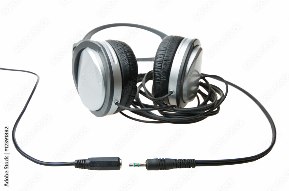 Headphones, cable and jack plug isolated on white