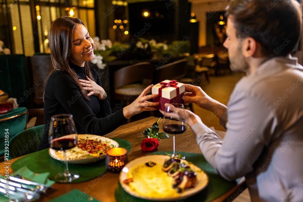 Boyfriend gifts his girlfriend red rose and gift on a romantic dinner for Valentine's day.