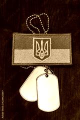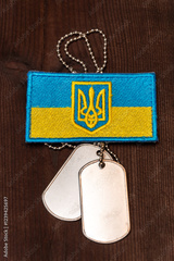 Soldier's badges and the national flag of Ukraine - a symbol of military service.