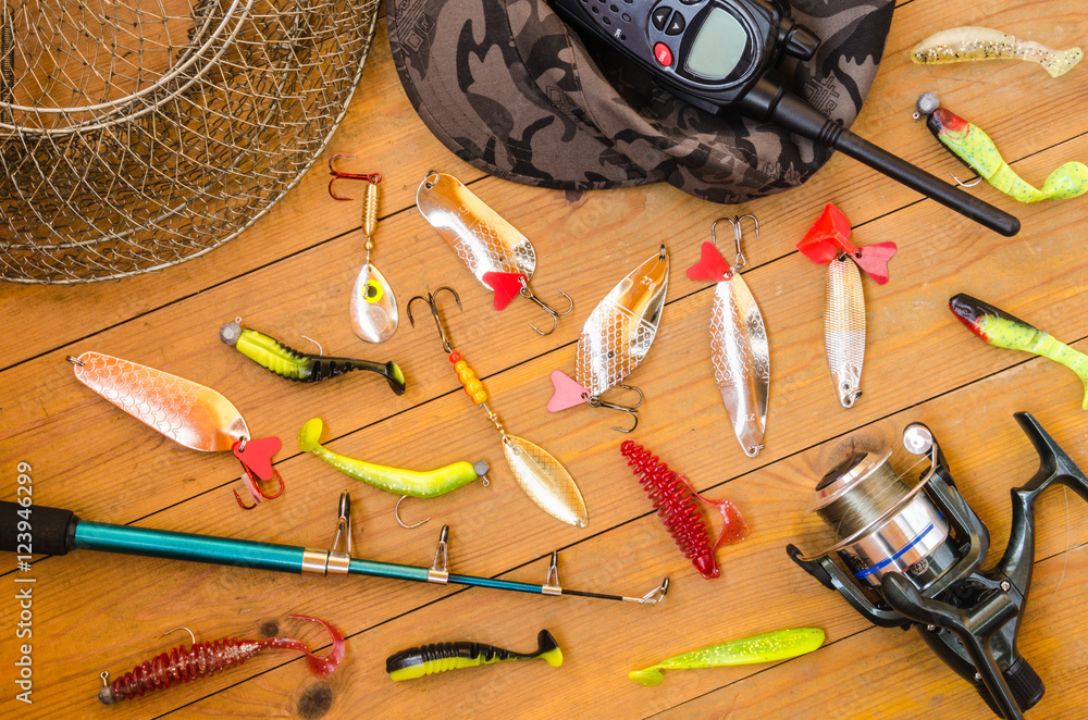 Fishing accessories for summer consisting of tackle, bait, lure, jig, hook, radio, reel, net. Wooden background. Outdoor activity and leisure concept.