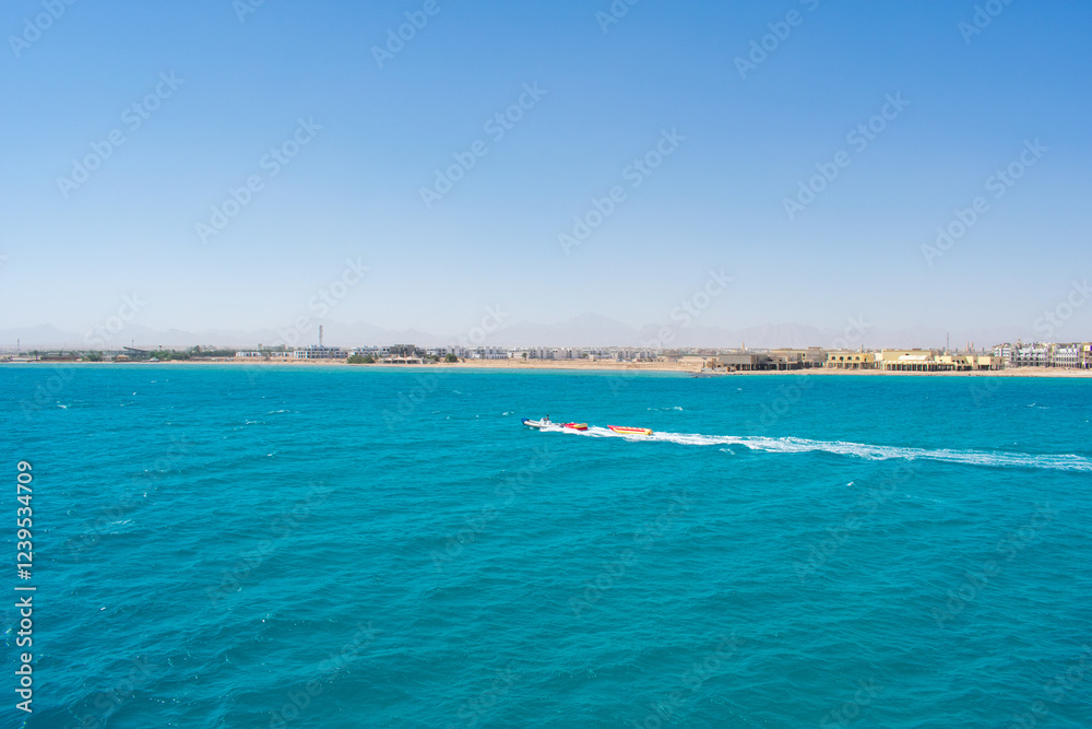 View from boat on Red Sea And Hurghada in Egypt. Cristal clear water and View at city.