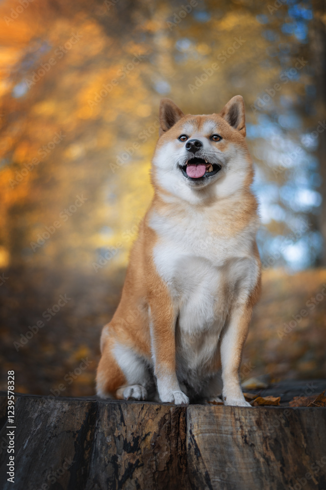 Shiba Inu dog is sitting on the tree stump in the park on sunny October day